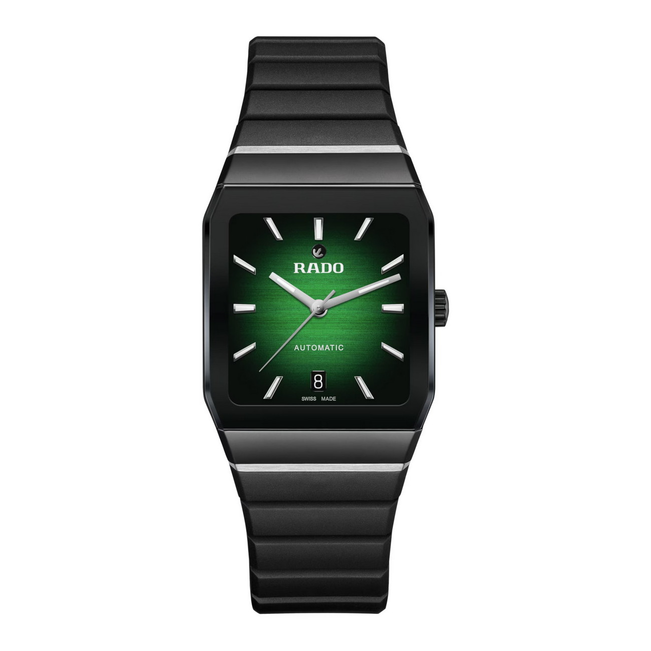 • Cassa: rettangolare ø 32.5 mm. H 11.3 mm • Materiale: ceramica high tech, acciaio, trattamento PVD • Vetro: zaffiro antigraffio antiriflesso • Movimento: svizzero automatico, riserva di carica 72 ore • Quadrante: verde sfumato nero, indici, color rodio, SuperLuminova, date • Bracciale: gomma nera • Chiusura: fibbia in acciaio spazzolato • Impermeabilità: 50 metri 5 bar • Peso: 90.6 g • Garanzia: 60 mesi
