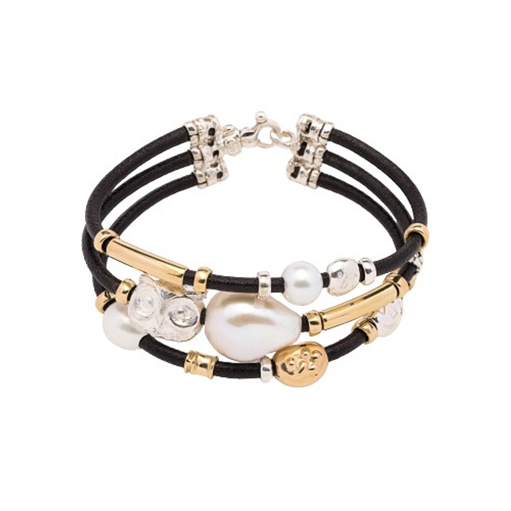 Bracciale tre fili in cuoio toscano 3mm con elementiin oro 18ct e argento lavorato a mano, pepita e perle naturali. Chiusura con moschettone.
