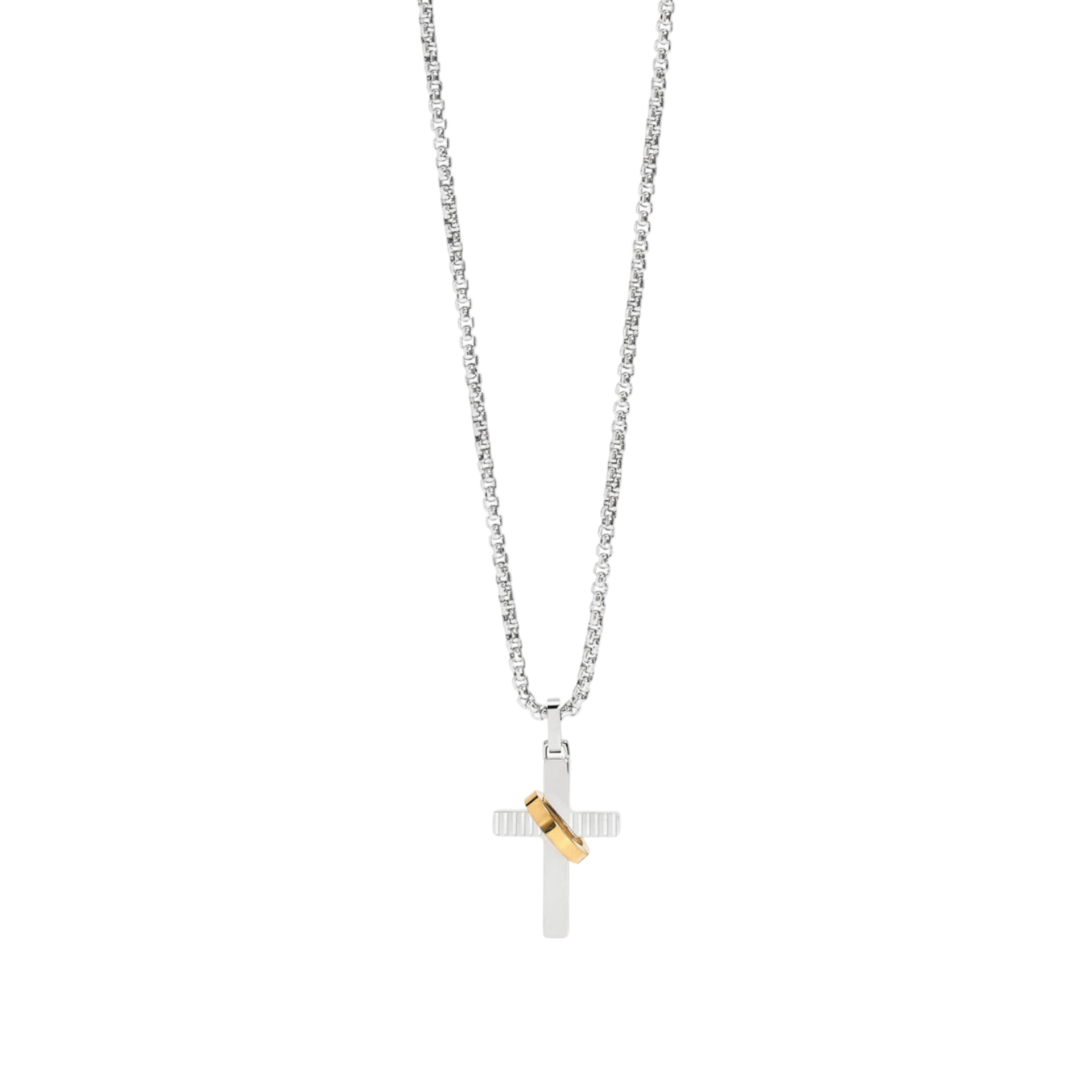 Collana in acciaio con croce e anello dorato. Un contrasto elegante, ideale per look contemporanei.