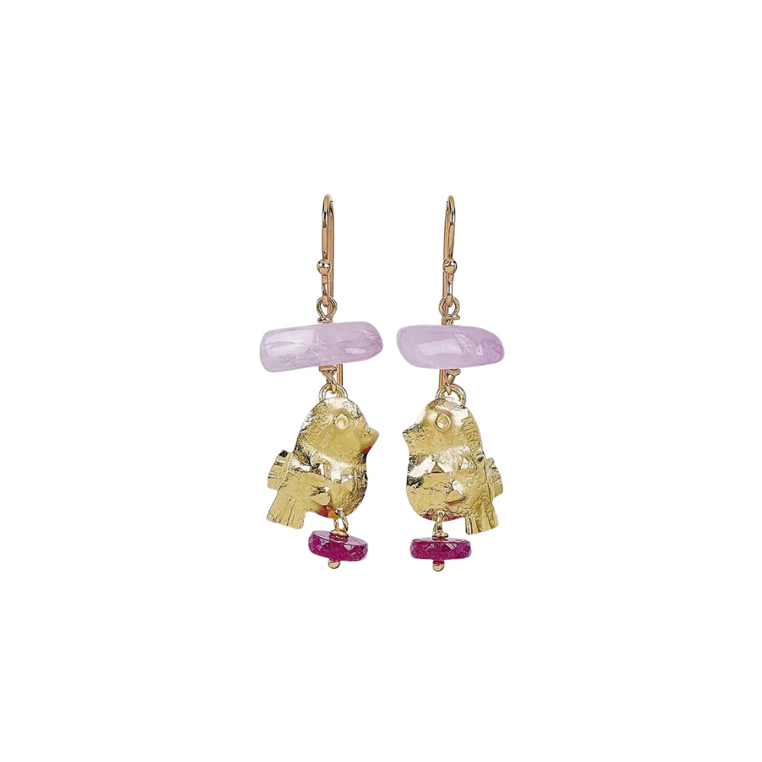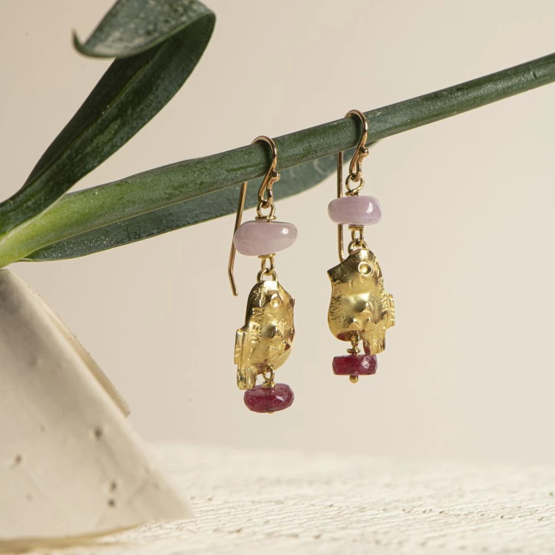 • Materiale: oro 18 kt, n.2 kunzite, n.2 rondelle di rubino • Dimensioni: h 4.5 cm • Chiusura: amo in oro