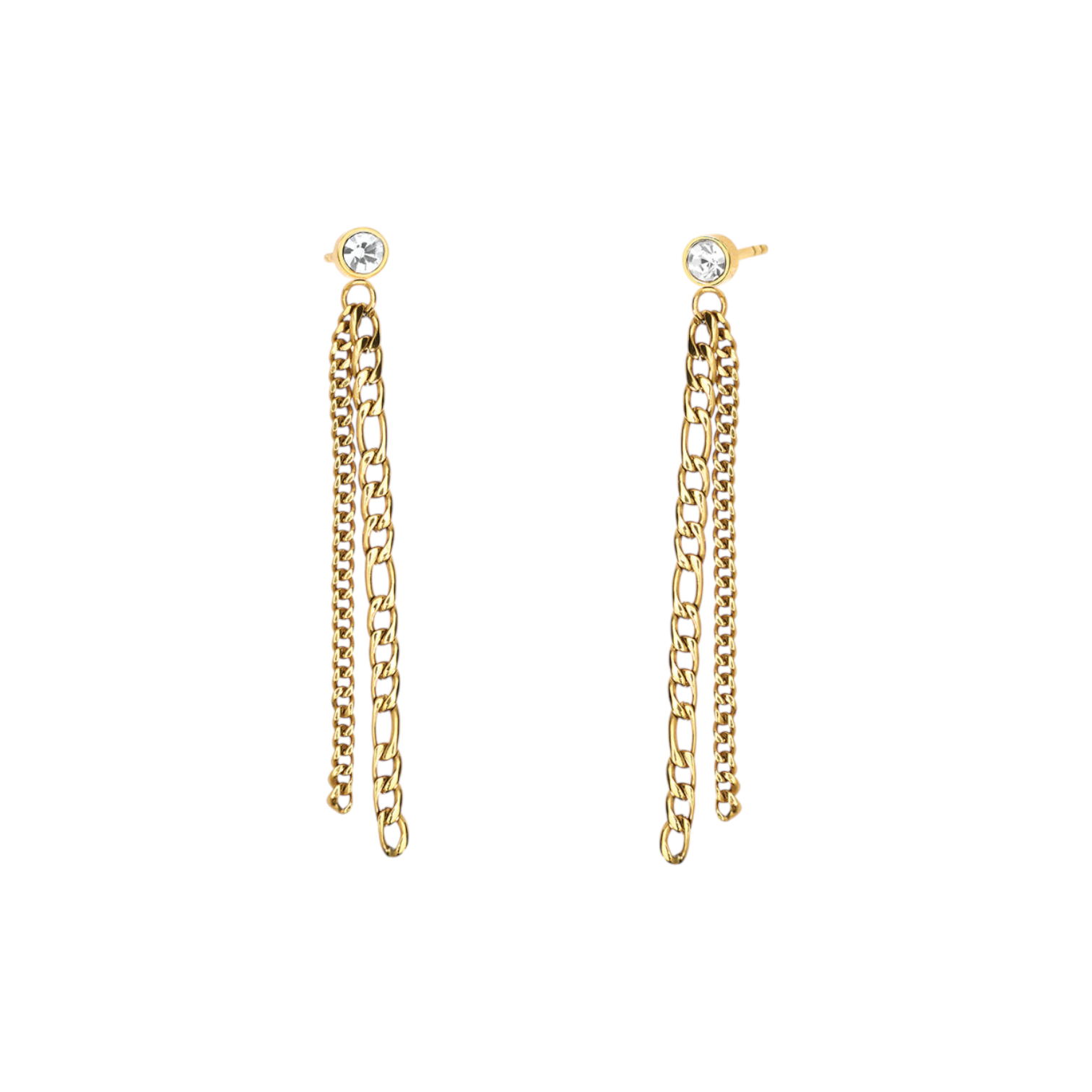 Orecchini in acciaio e PVD giallo con catene figaro/groumette e cristallo. Eleganti e luminosi, perfetti per la sera.