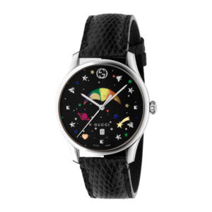 Il quadrante nero ospita stelle, pianeti e comete multicolore, insieme a elementi distintivi come l’ape GUCCI, rendendo ogni dettaglio una celebrazione dell’immaginario onirico del brand. Il movimento è al quarzo Swiss Made, preciso e affidabile, arricchito dalla funzione data.